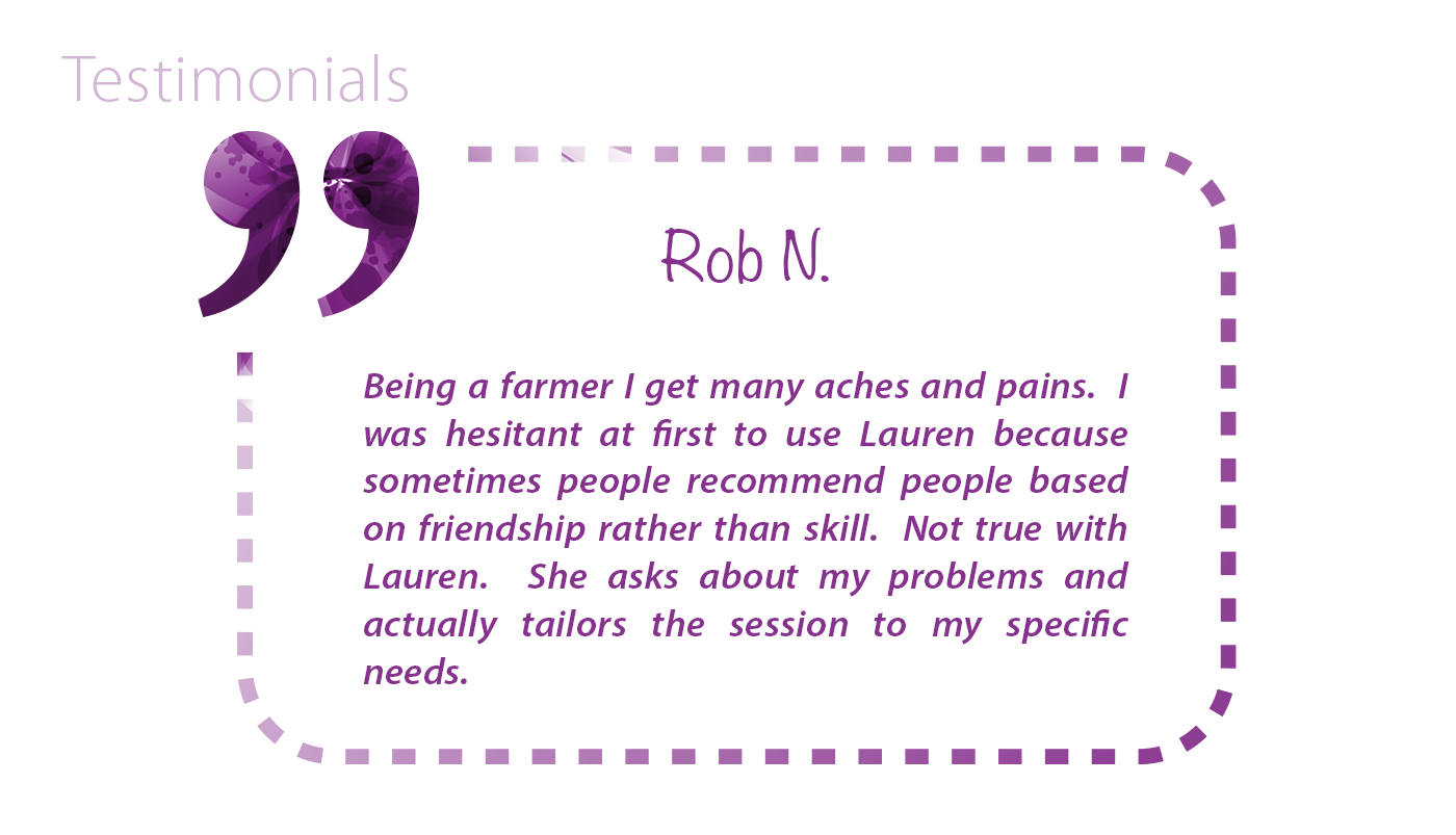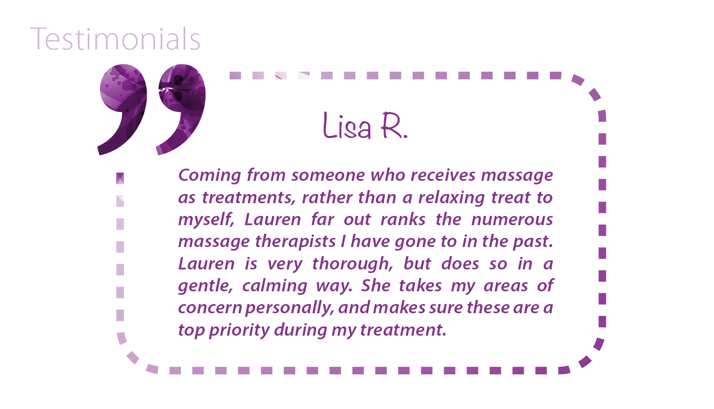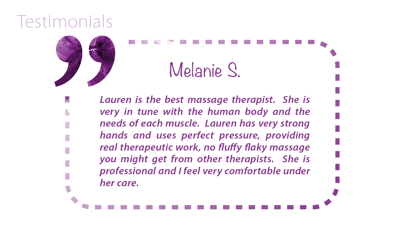 During my time in the massage therapy field I have worked hard to build a loyal client base through my consistency, reliability and quality of treatment. I cannot give my clients the massage they need unless they communicate with me. It is extremely important to listen to my clients.